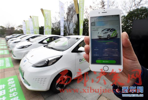 12月22日,在南京市江寧會展中心租還車網(wǎng)點的展示體驗區(qū),工作人員展示分時租賃電動汽車的手機預(yù)約平臺。