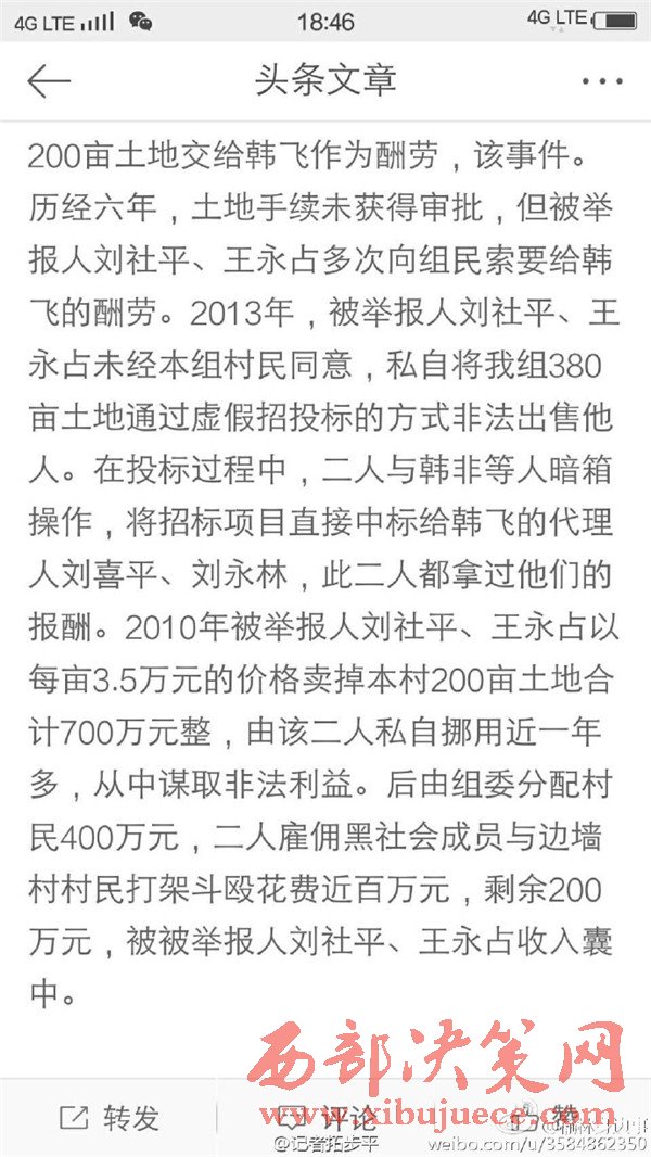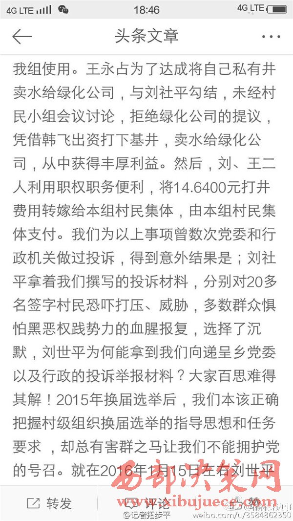 近日有微博網(wǎng)友飆新聞微博爆料:自被舉報(bào)人劉社平、王永占二人任職以來,一手把持組委,視組委為自家私有權(quán)力,從來不向組民公布賬務(wù)。他們不但不為組民謀利,反而利用職務(wù)便利將村民集體數(shù)千萬財(cái)產(chǎn)據(jù)為己有。請相關(guān)部門調(diào)查回復(fù)!