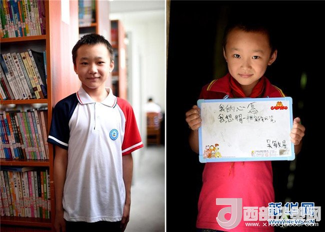 這是一張拼版圖片。左圖為2018年5月30日,在廣西三江侗族自治縣洋溪鄉(xiāng)中學(xué),12歲的吳敏星在圖書館里留影;右圖為2014年5月26日,吳敏星在吊腳樓教室里展示他的“六一”心愿。