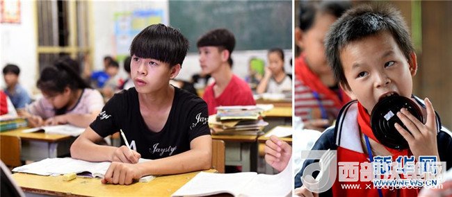 這是一張拼版圖片。左圖為2018年5月30日,在廣西三江侗族自治縣洋溪鄉(xiāng)中學(xué),15歲的秦保軍在教室里上課;右圖為2014年6月10日,秦保軍在吊腳樓教室里吃愛心人士送來的節(jié)日蛋糕。