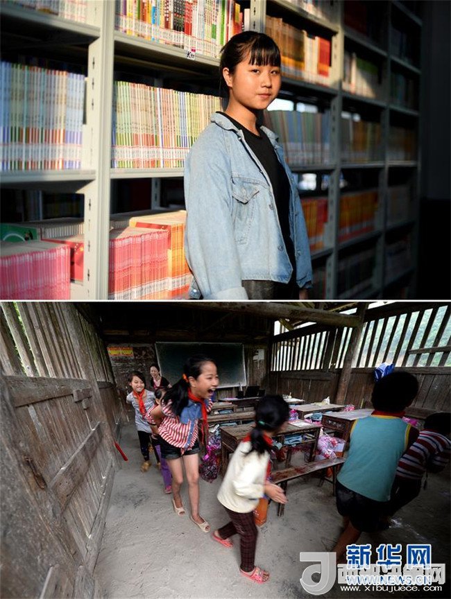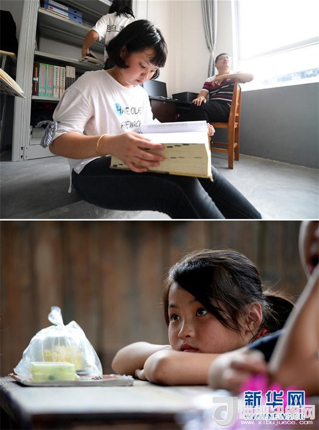 這是一張拼版圖片。上圖為2018年5月30日,在廣西三江侗族自治縣洋溪鄉(xiāng)中學(xué),13歲的吳美新在圖書館里看書;下圖為2014年5月26日,吳美新站在吊腳樓教室門口張望。