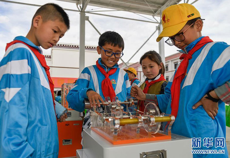 幾名學(xué)生在拉薩市流動科技館巡展活動現(xiàn)場體驗(yàn)科學(xué)小實(shí)驗(yàn)(5月24日攝)。 新華社記者 劉東君 攝