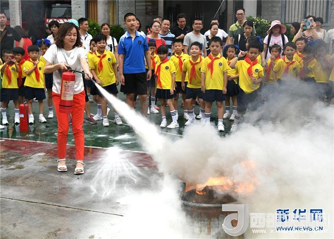 6月2日,一名家長(前)在廣西南寧市青秀區(qū)公安消防大隊(duì)柳沙中隊(duì)體驗(yàn)用滅火器滅火。
