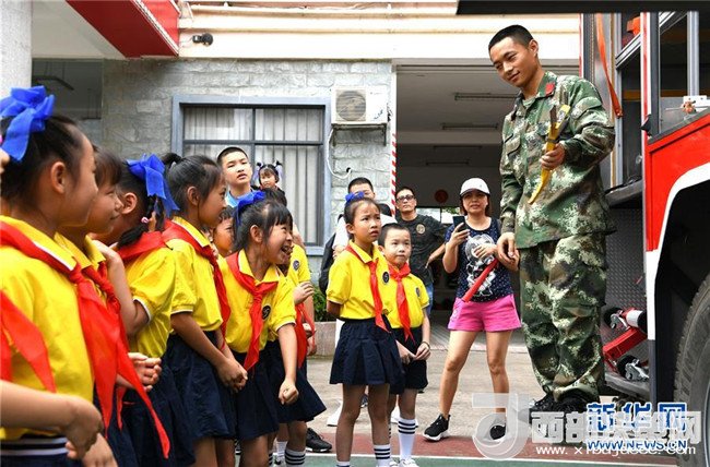 當(dāng)日,數(shù)十名來自廣西南寧市濱湖路小學(xué)的孩子們和家長一起走進(jìn)青秀區(qū)公安消防大隊(duì)柳沙中隊(duì),參加消防疏散演習(xí)、參觀消防車、了解消防設(shè)備設(shè)施用途,在親子活動(dòng)中學(xué)習(xí)消防知識(shí)。新華社記者 周華 攝